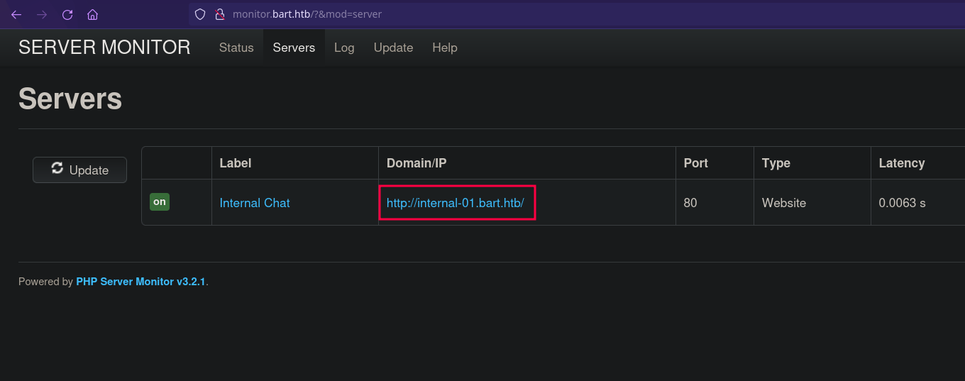 Al pulsar en cualquier secciĂłn, nos redirige al subdominio monitor.bart.htb. Lo damos de alta en el archivo hosts y continuamos.