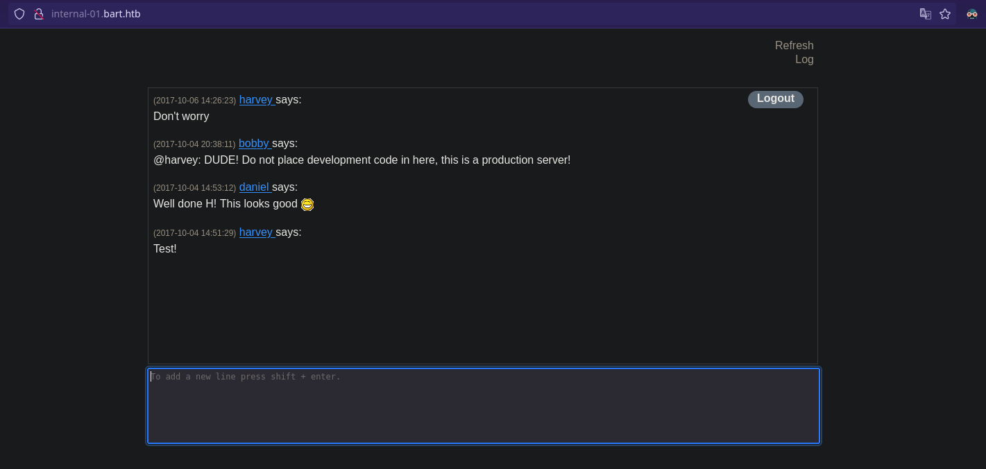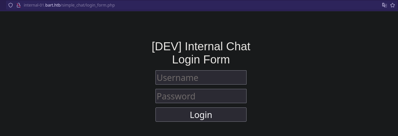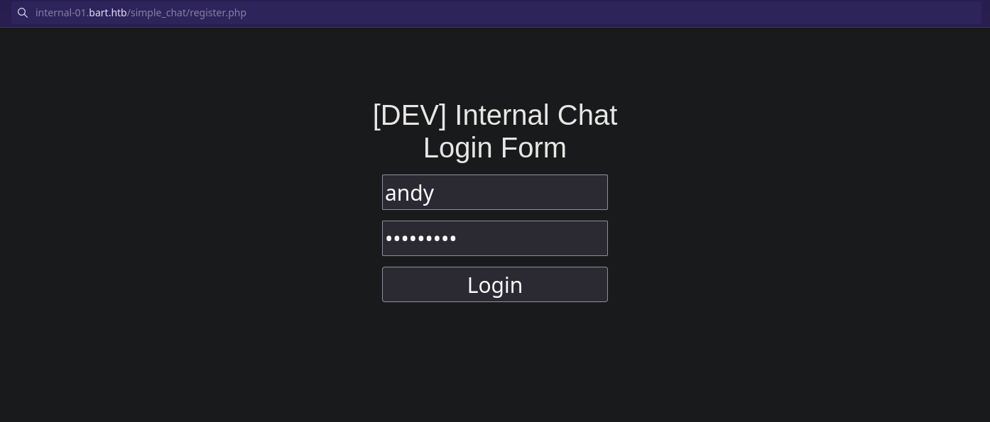 $ curl -s -X POST "http://internal-01.bart.htb/simple_chat/register.php" -d 'uname=andy&passwd=andy12345'