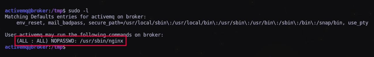activemq@broker:/tmp$ sudo /usr/sbin/nginx -c /tmp/nginx.conf