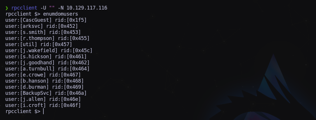$ rpcclient -U "" -N 10.129.117.116 -c "enumdomusers" | grep -oP '\[.*?\]' | grep -v 0x | tr -d '[]' > users.txt