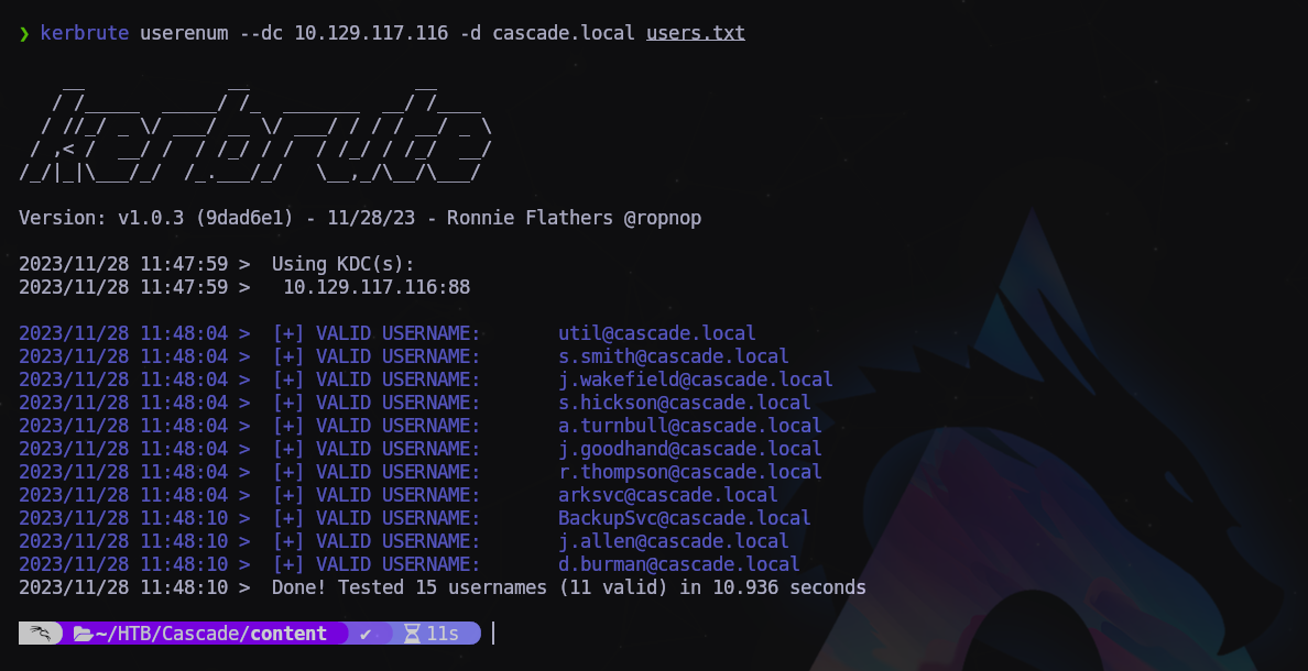 $ kerbrute userenum --dc 10.129.117.116 -d cascade.local users.txt