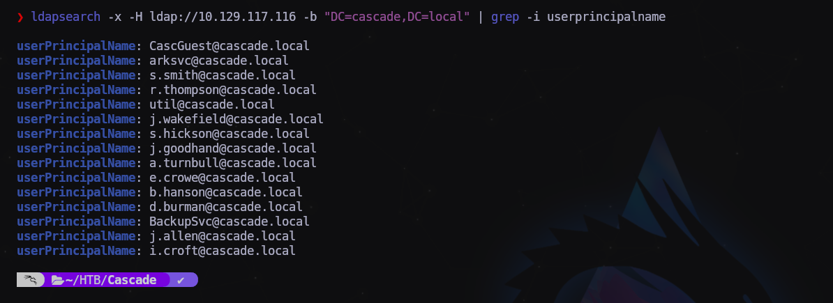 $ ldapsearch -x -H ldap://10.129.117.116 -b "DC=cascade,DC=local" | grep -i userprincipalname
