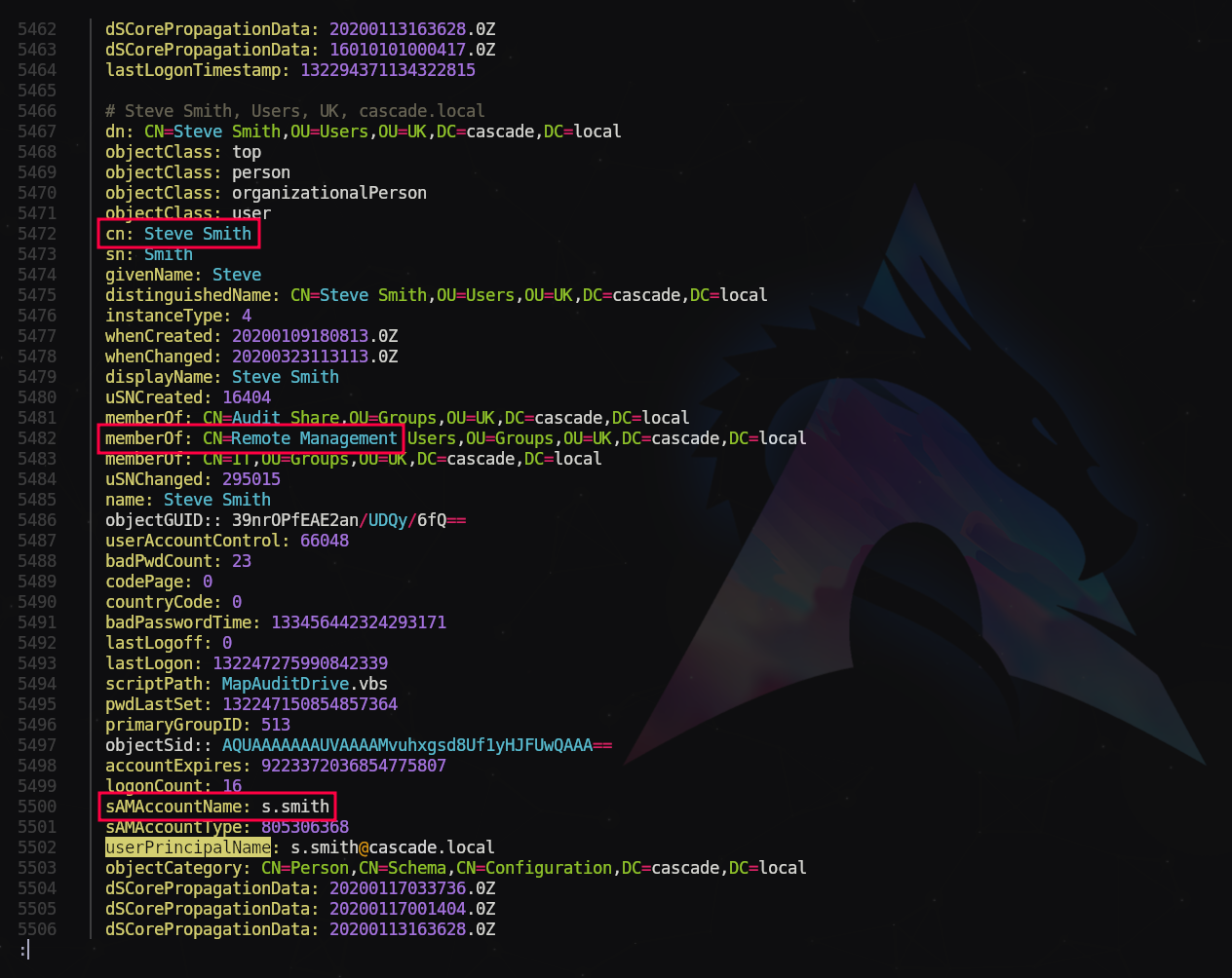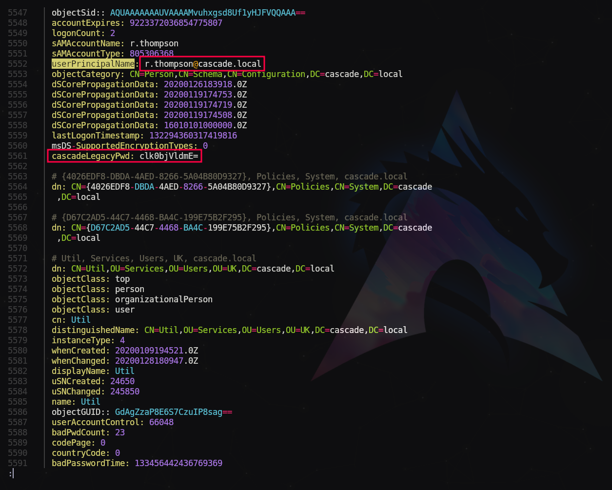 $ ldapsearch -x -H ldap://10.129.117.116 -b "DC=cascade,DC=local" | cat -l rb