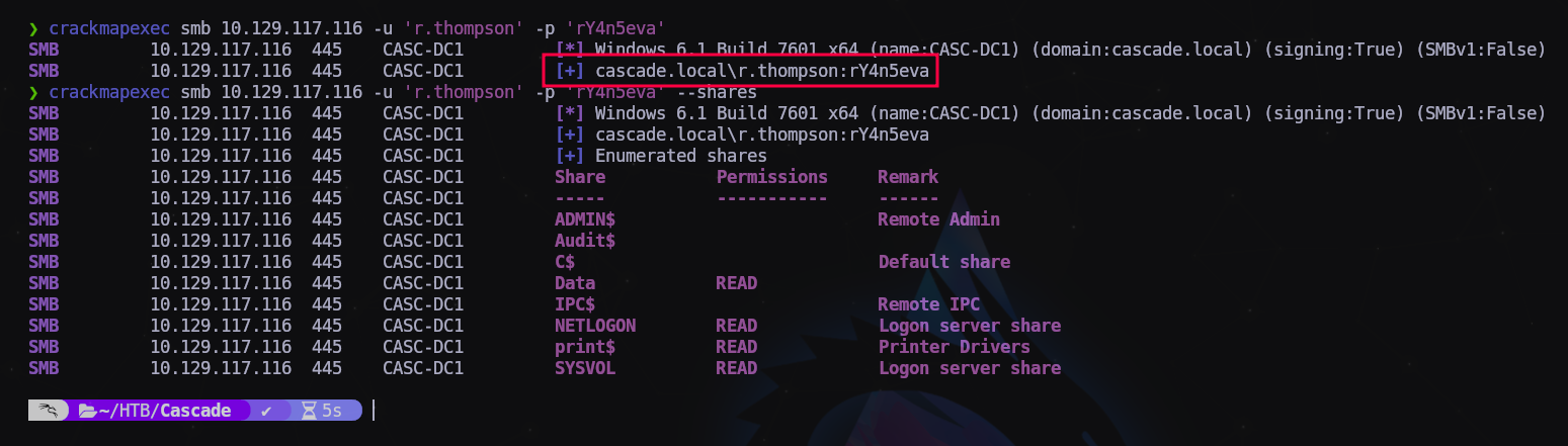 $ crackmapexec smb 10.129.117.116 -u 'r.thompson' -p 'rY4n5eva'