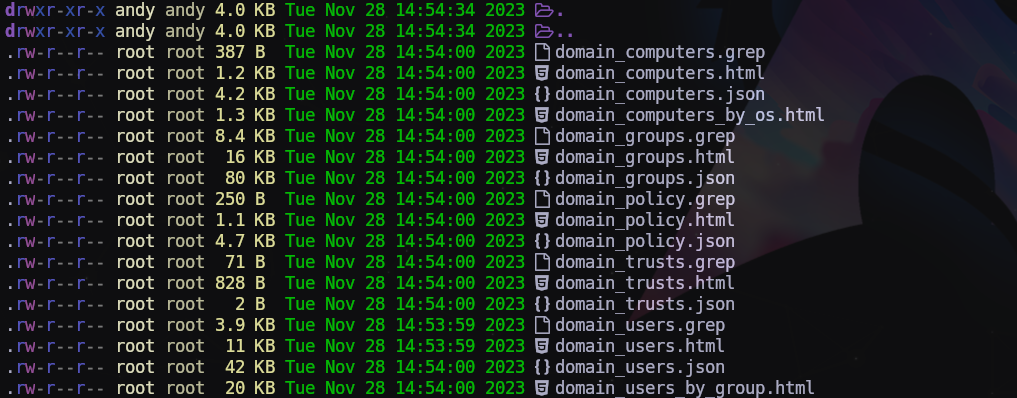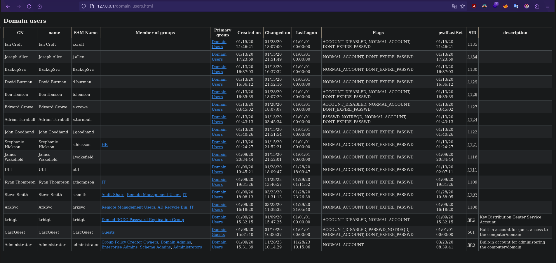 Ahora ya podemos tener de una manera más visual la información del dominio. Levantamos un servidor http con Python y accedemos a la URL http://127.0.0.1/domain_users.html