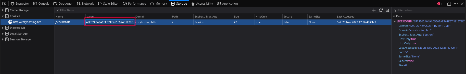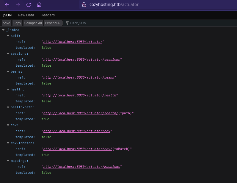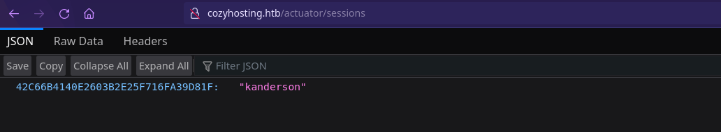 Entramos en http://cozyhosting.htb/actuator/sessions para echar un vistazo y vemos esto: