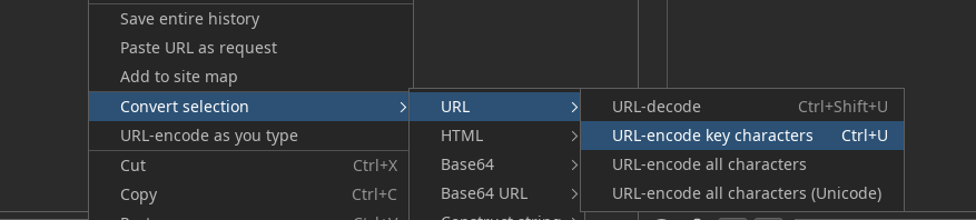 Ahora seleccionamos toda la lĂnea del payload, botĂłn secundario del ratĂłn Convert selection > URL > URL-encode key characters.