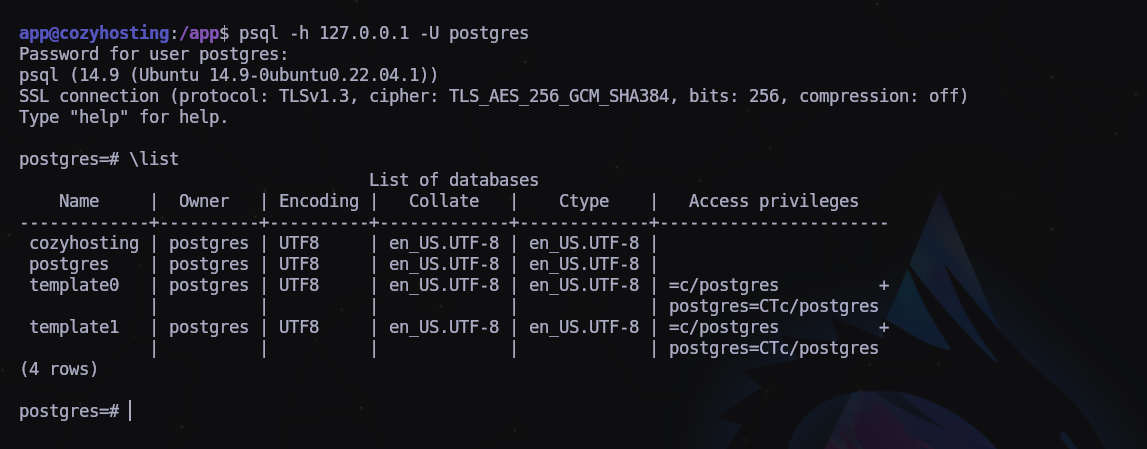 $ wfuzz -c -w /usr/share/wordlists/dirbuster/directory-list-2.3-medium.txt --hc 404 --hh 12706 -t 500 http://cozyhosting.htb/FUZZ