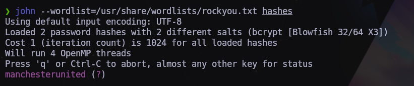 $ john --wordlist=/usr/share/wordlists/rockyou.txt hashes