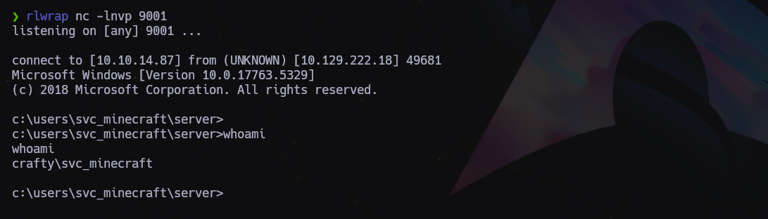 Nos ponemos en escucha por el puerto 9001 (con rlwrap delante porque esperamos una consola Windows)