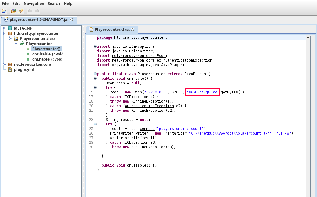 Nos vamos a htb.crafty.playercounter > Playercounter > Playercounter() y vemos un string cifrado o contraseña de una conexión interna en el puerto 27015. La copiamos y seguimos.