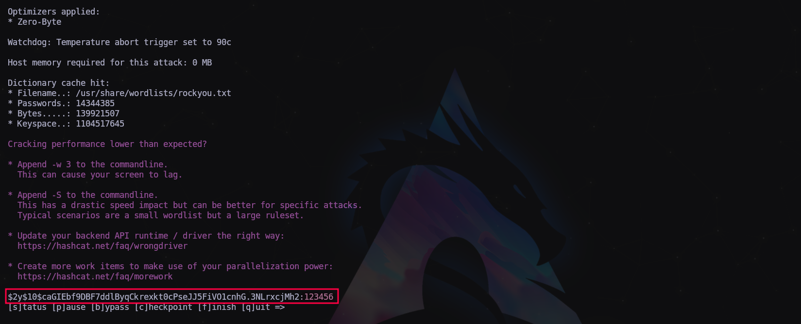 $ hashcat -m 3200 hashes /usr/share/wordlists/rockyou.txt -r /usr/share/hashcat/rules/best64.rule --force
