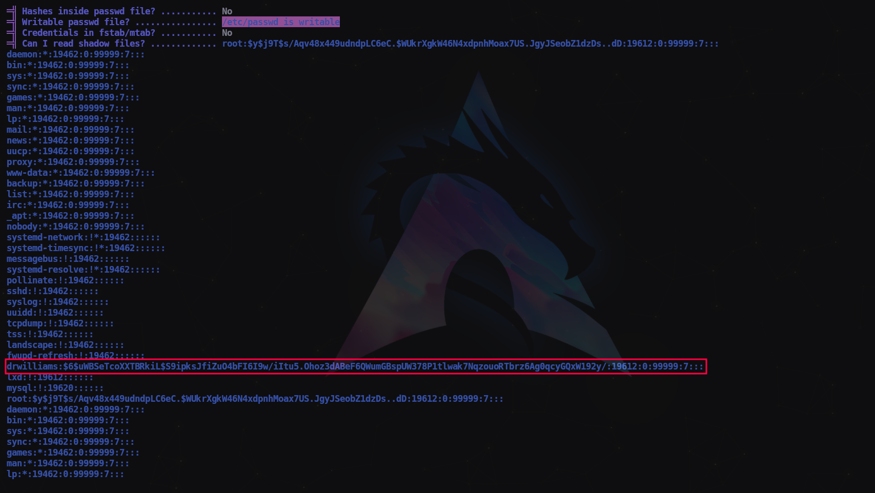 Encontramos el hash del usuario drwilliams en el archivo /etc/shadow