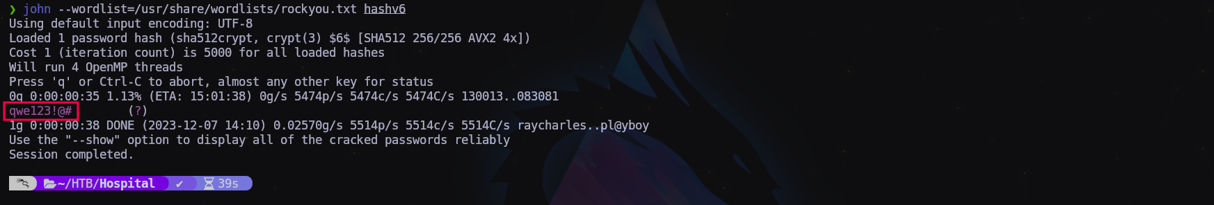 $ john --wordlist=/usr/share/wordlists/rockyou.txt hashv6