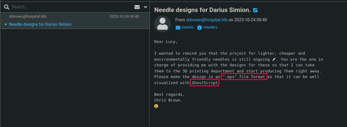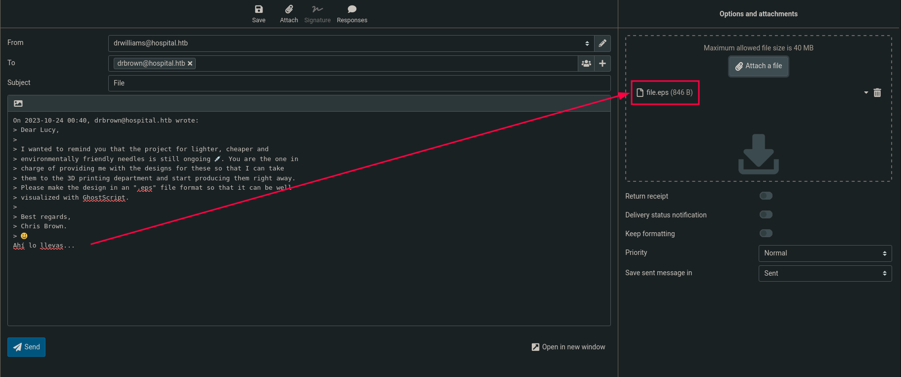Una vez generado el archivo file.eps se lo enviaremos por correo a drbrown@hospital.htb desde la web de RoundCube del hospital.