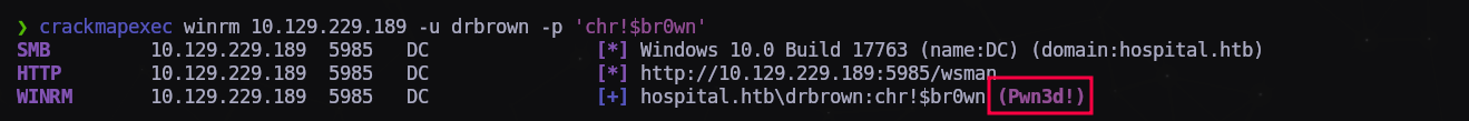 $ crackmapexec winrm 10.129.229.189 -u drbrown -p 'chr!$br0wn'