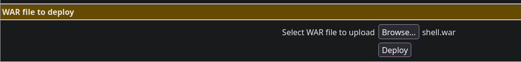 Una vez creado nos vamos a la sección “WAR file to deploy” y subimos el .war malicioso: