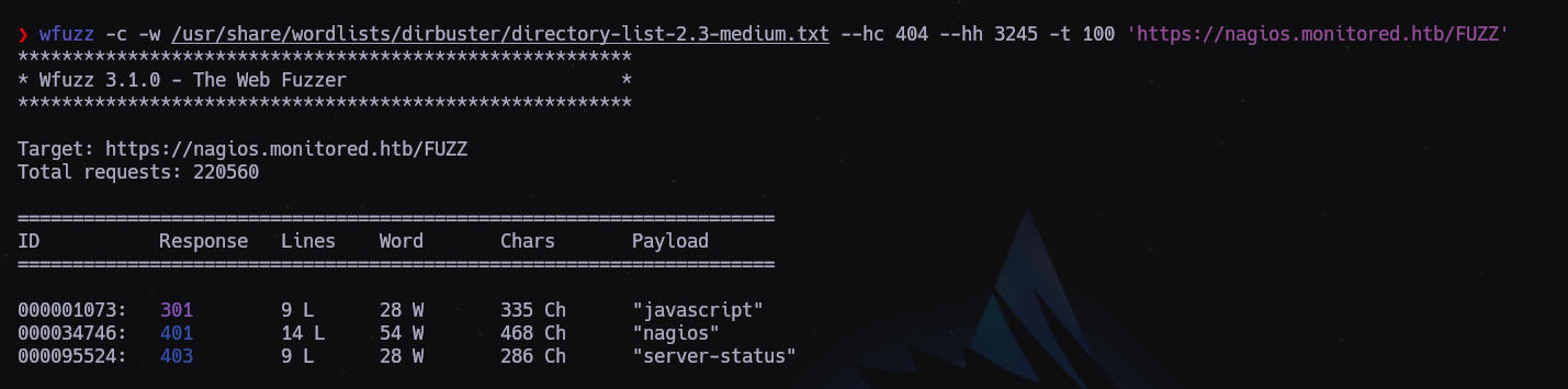 wfuzz -c -w /usr/share/wordlists/dirbuster/directory-list-2.3-medium.txt --hc 404 --hh 3245 -t 100 'https://nagios.monitored.htb/FUZZ'