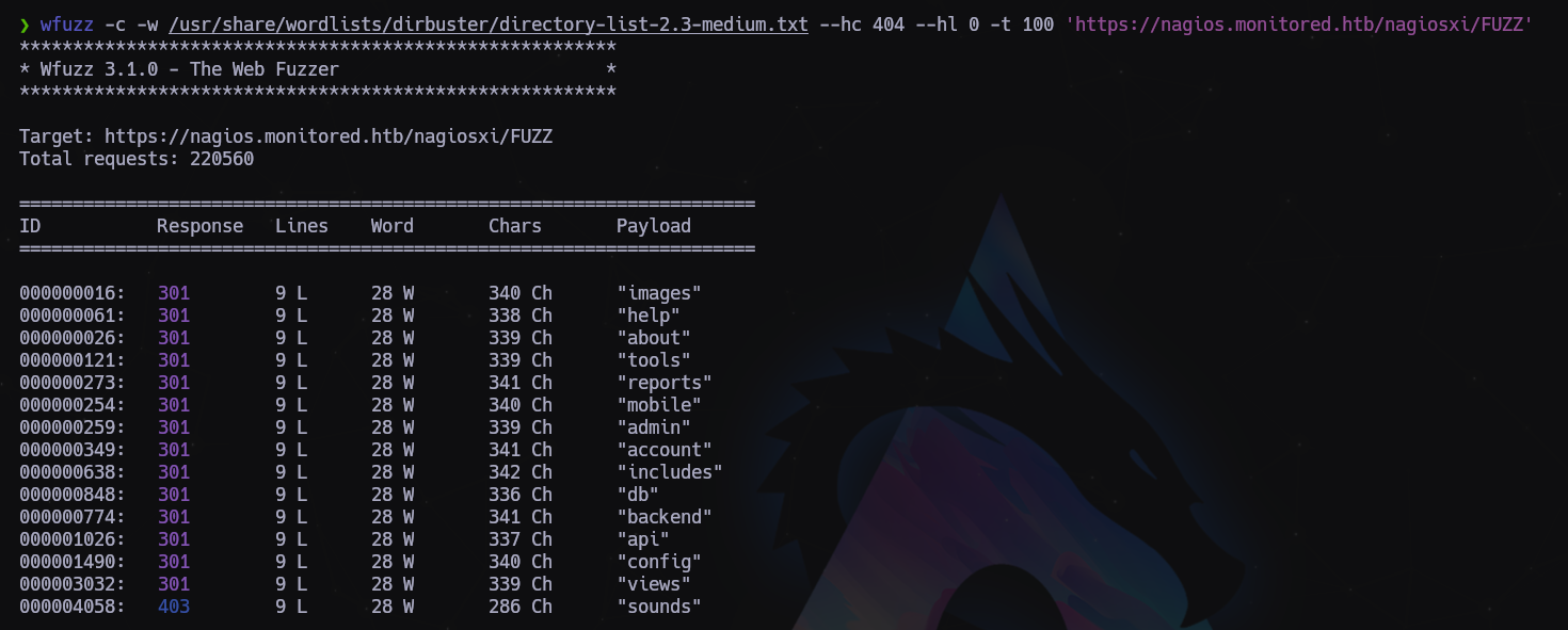 $ wfuzz -c -w /usr/share/wordlists/dirbuster/directory-list-2.3-medium.txt --hc 404 --hl 0 -t 100 'https://nagios.monitored.htb/nagiosxi/FUZZ'