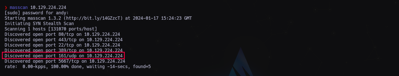 sudo masscan -e tun0 -p1-65535,U:1-65535 --rate 500 10.129.224.224
