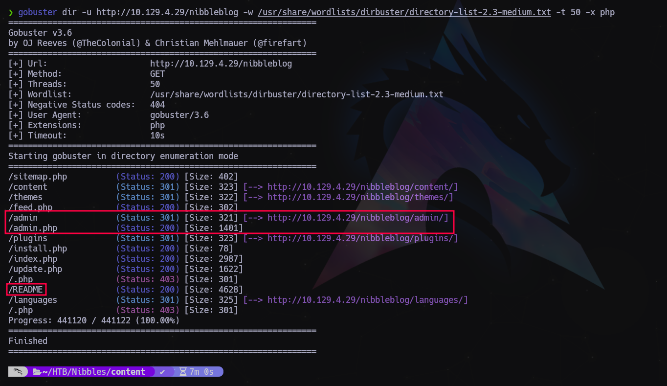 $ gobuster dir -u http://10.129.4.29/nibbleblog -w /usr/share/wordlists/dirbuster/directory-list-2.3-medium.txt -t 50 -x php