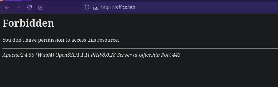https://10.129.198.86 [403 Forbidden] Apache[2.4.56], Country[RESERVED][ZZ], HTTPServer[Apache/2.4.56 (Win64) OpenSSL/1.1.1t PHP/8.0.28], IP[10.129.198.86], OpenSSL[1.1.1t], PHP[8.0.28], Title[403 Forbidden]