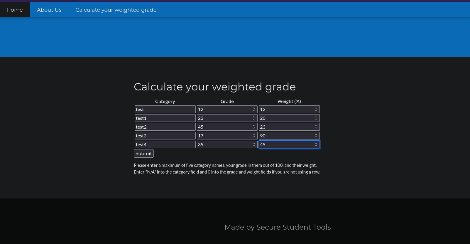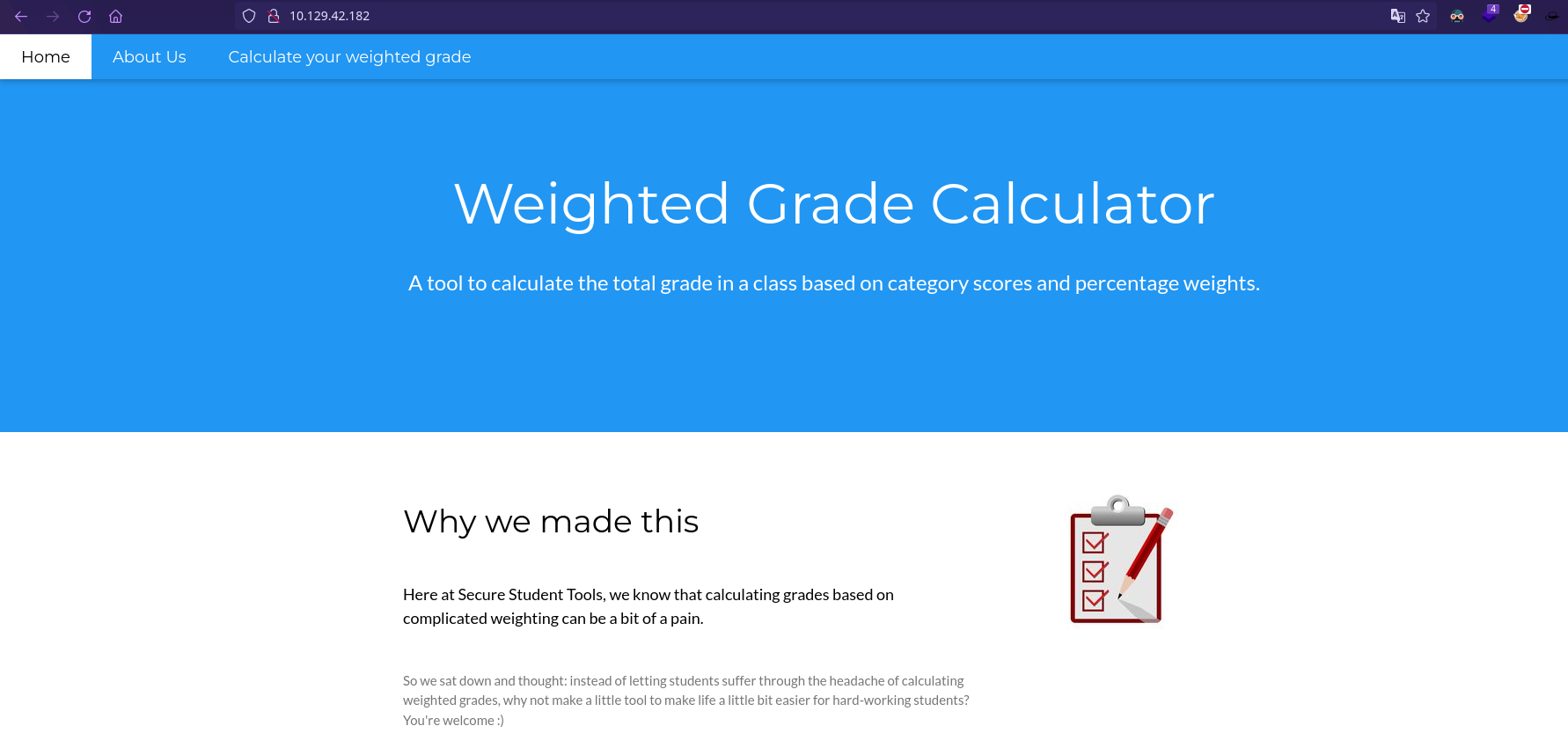 http://10.129.42.182 [200 OK] Country[RESERVED][ZZ], HTTPServer[nginx, WEBrick/1.7.0 (Ruby/3.0.2/2021-07-07)], IP[10.129.42.182], PoweredBy[WEBrick], Ruby[3.0.2], Script, Title[Weighted Grade Calculator], UncommonHeaders[x-content-type-options], X-Frame-Options[SAMEORIGIN], X-XSS-Protection[1; mode=block]