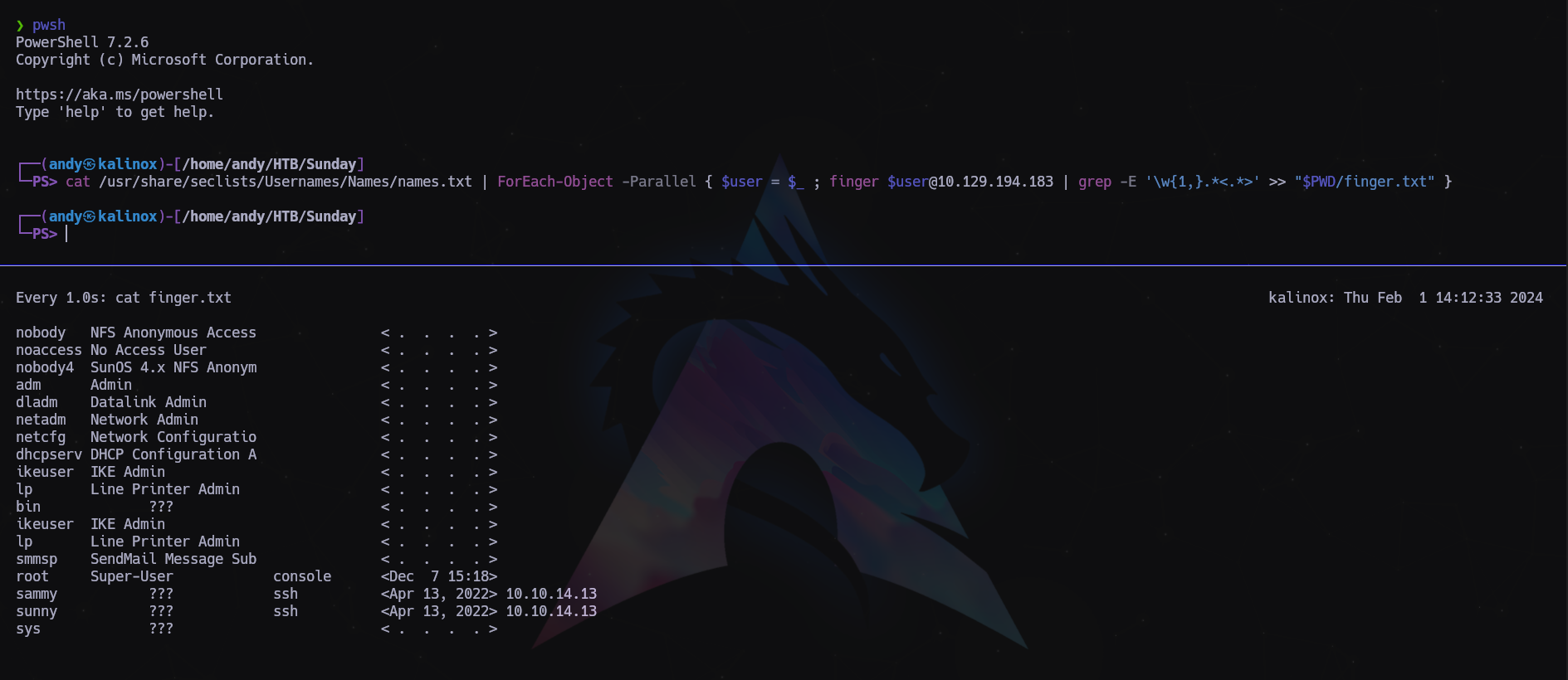 > cat /usr/share/seclists/Usernames/Names/names.txt | ForEach-Object -Parallel { $user = $_ ; finger $user@10.129.194.183 | grep -E '\w{1,}.*<.*>' >> "$PWD/finger.txt" }