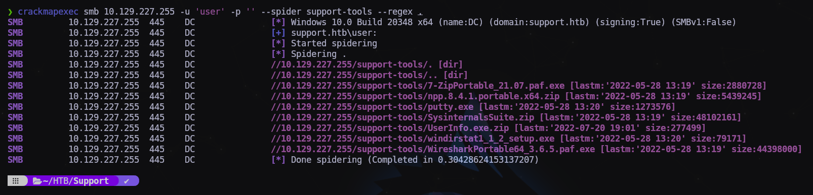 $ crackmapexec smb 10.129.227.255 -u 'user' -p '' --spider support-tools --regex .