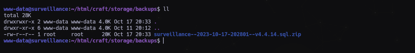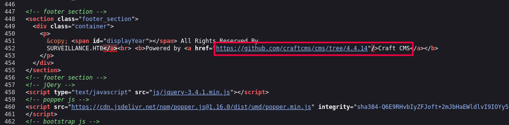 http://surveillance.htb [200 OK] Bootstrap, Country[RESERVED][ZZ], Email[demo@surveillance.htb], HTML5, HTTPServer[Ubuntu Linux][nginx/1.18.0 (Ubuntu)], IP[10.129.230.42], JQuery[3.4.1], Script[text/javascript], Title[Surveillance], X-Powered-By[Craft CMS], X-UA-Compatible[IE=edge], nginx[1.18.0]