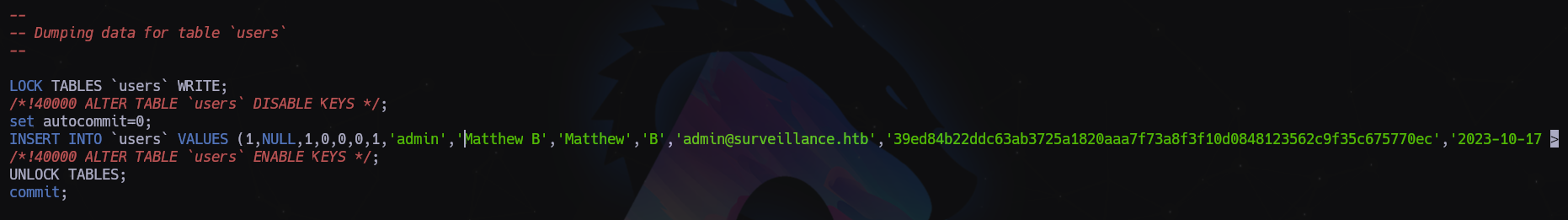 El archivo es un script SQL para crear la BBDD. Lo examinamos y vemos que en la tabla Users se crea el usuario Matthew con credenciales cifradas.