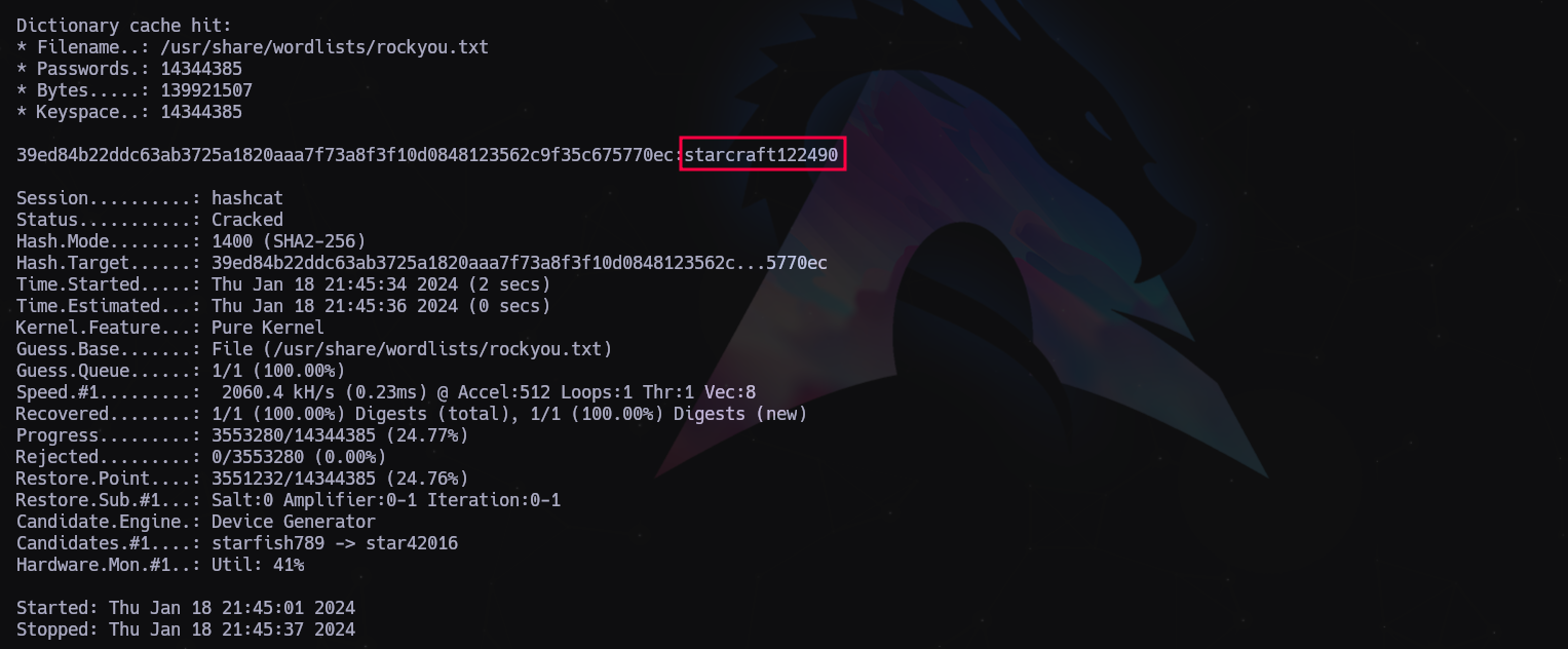 $ hashcat -m 1400 hash /usr/share/wordlists/rockyou.txt
