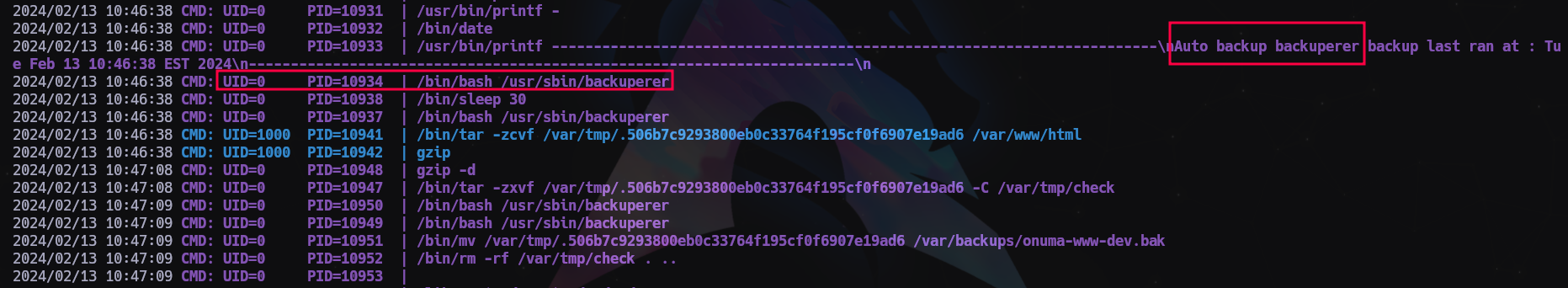 El usuario root ejecuta una tarea con el script o binario backuperer y luego lo borra.
